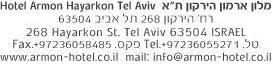 Armon Hayarkon Hotel Tel Aviv is a business and pleasure hotel in Tel Aviv located on Hayarkon Street, in one of Tel-Aviv's most lucrative areas, two minutes from the sea, Tel-Aviv port, marina, bars, clubs, cinemas, shopping centres and ethnic restaurants. Also, Tel-Aviv's domestic airport (Sde-Dov) is about 5 minutes drive away with regular flights between Tel-Aviv and the city of Eilat. A small, yet highly professional team will welcome you at the Armon Hayarkon Hotel. We will always do our best to answer your needs before and during your stay with us. Please do not hesitate to contact any member of our staff regarding places to go, things to see, restaurants, night clubbing and transportation. The Armon Hayarkon Hotel offers modern, spacious rooms, well designed to allow both business and leisure guests to enjoy our facilities, which include a 50-channel cable TV, internet access (free), refrigerator, air conditioning, telephone and more, parking upon availability.